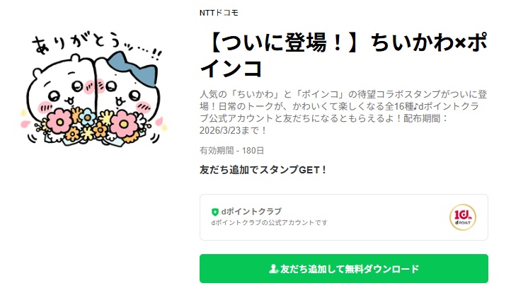 ちいかわとポインコのコラボLINEスタンプが無料でダウンロードできます!むちゃかわなスタンプは全部で16種類。配布期間は2026/3/23まで!どんなスタンプがあるのかチェックしていきましょう♪