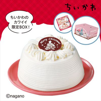 ふんわりしたドーム状のケーキがホワイトクリスマスをイメージさせます。直径15cm×高さ6cmの5号相当(4~6人向け)サイズのケーキを、ちいかわたちのオリジナルイラストボックスに入れてお届け。
