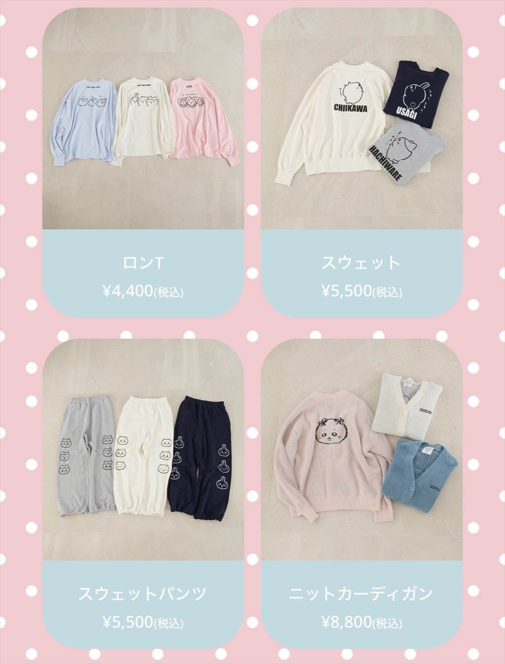 ロンTやスウェット、カーディガンなど、普段使いしやすいアイテムが中心で、さりげなくちいかわの世界観を取り入れられるデザイン。